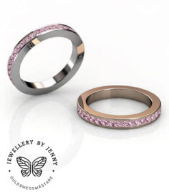 Denna alliansring med rosa safirer går att beställa i olika prisklasser beroende på antal stenar samt storlek på dessa. Vi tillverkar dem i 18 k vitguld, rödguld roséguld samt platina och de har alla gemensamt att vid köp av denna ring så går 20% oavkortat till Cancerfonden.