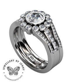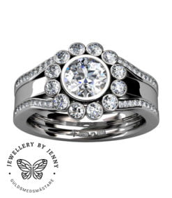 Som vigselring så kompletteras ringen med två stycken sidoringar vilket skapar en haloring.