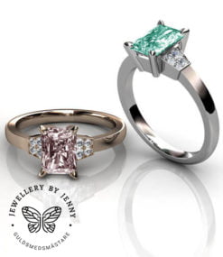 I skenan sitter det totalt 8 stycken briljantslipade diamanter infattade och bilderna visar olika varianter av mittsten. Diamant, rosa morganit, samt en blågrön turmalin.