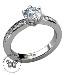 Briljantslipad diamant som mittsten som framhävs extra av de briljantslipade diamanterna i skenan.