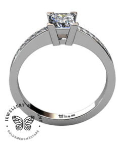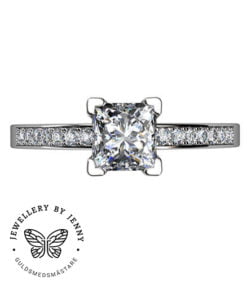 En vacker diamantring med en prinsesslipad diamant som mittsten som framhävs av de mindre briljantslipade diamanterna i skenan.