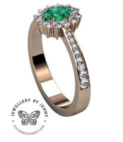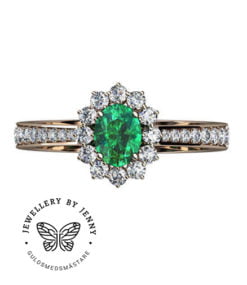 Denna diamantring i guld har en oval mittsten med briljantslipade diamanter runt. Även i skenan så är det infattade briljantslipade diamanter.