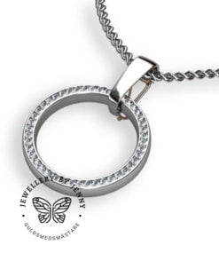 I flera yrken idag exempelvis inom sjukvården och inom restaurang så får man inte bära sina ringar. Många väljer då att bära sin ring i en kedja kring halsen vilket vi nu har utvecklat ett snyggt och smidigt hängsmycke för ändamålet. Detta hängsmycke har en öppningsbar baksida så att Ni lätt kan hänga Er ring på plats och sedan knäppa igen.