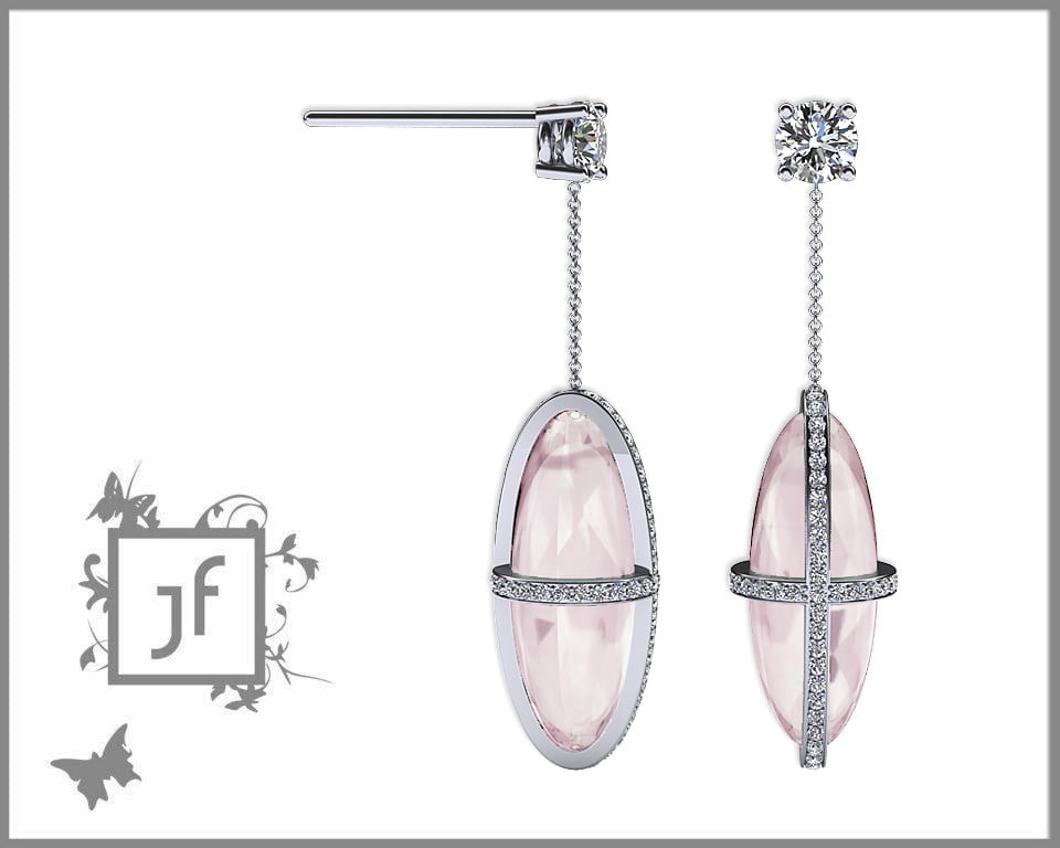 Örhängen/påhängen i roséguld med ett par magnifika morganitdroppar (mått 21 x 9 mm) som dinglar vackert från en rad med dosserade briljantslipade diamanter som framhäver den rosa färgen hos morganiterna.